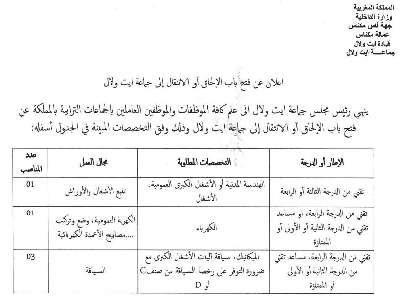 اعلان عن فتح باب الإلحاق أو الانتقال إلى جماعة ايت ولال